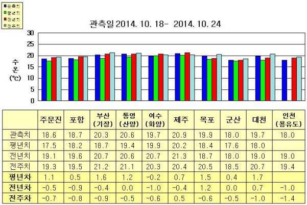 ◦ 금주(2014. 10. 18~2014. 10. 24)의 한반도 연안 표면수온은 동해 연안역에서 섭씨 18.5~20.5도, 남해 연안역 19.5~21.0도, 서해 연안역에서 18~20도로 나타납니다. ◦ 평년에 비해 동해 연안역은 0.5~2.0도 높게, 여수(화양) 비슷함을 제외한 남해 연안역은 0.5~1.5도 높게, 서해 연안역은 0.5~2.0도 높게 나타납니다. ◦ 전년에 비해 동해 연안역은 0.5~1.0도 낮게, 통영(산양) 비슷함을 제외한 남해 연안역은 0.5~1.0도 낮게, 군산 비슷하게, 인천 1도 낮음을 제외한 서해 연안역은 0.5~1.5도 높게 나타납니다. |
