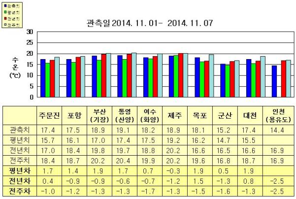 ◦ 금주(2014. 11. 01~2014. 11. 07)의 한반도 연안 표면수온은 동해 연안역에서 섭씨 17~19도, 남해 연안역 18.0~19.5도, 서해 연안역에서 14.0~18.5도로 나타납니다. ◦ 평년에 비해 동해 연안역은 1~2도 높게, 제주 비슷함을 제외한 남해 연안역은 0.5~2.0도 높게, 서해 연안역은 0.5~2.0도 높게 나타납니다. ◦ 전년에 비해 주문진 0.4도 높음을 제외한 동해 연안역은 0.5~1.0도 낮게, 남해 연안역은 0.5~1.5도 낮게, 목포 1.5도, 대천 0.8도 높음을 제외한 서해 연안역은 1.0~2.5도 낮게 나타납니다.