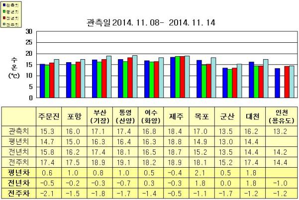 ◦ 금주(2014. 11. 08~2014. 11. 14)의 한반도 연안 표면수온은 동해 연안역에서 섭씨 15.0~17.5도, 남해 연안역 16.5~18.5도, 서해 연안역에서 13~17도로 나타납니다. ◦ 평년에 비해 동해 연안역은 0.5~1.0도 높게, 제주 0.4도 낮음을 제외한 남해 연안역은 0.5~1.0도 높게, 서해 연안역은 0.5~2.5도 높게 나타납니다. ◦ 전년에 비해 주문진 0.5도 낮음을 제외한 동해 연안역은 비슷하게, 통영(산양) 0.7도 낮음을 제외한 남해 연안역은 비슷하게, 서해 연안역은 목포, 대천 1.8도 높게, 군산 비슷하게, 인천(용유도) 1도 낮게 나타납니다. |