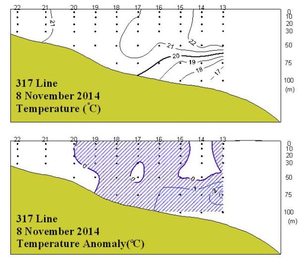 북부해역(317선)의 수온 수직분포도와 평년편차도입니다.