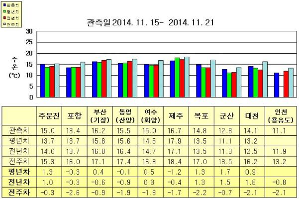 ◦ 금주(2014. 11. 15~2014. 11. 21)의 한반도 연안 표면수온은 동해 연안역에서 섭씨 13.0~16.5도, 남해 연안역 15~17도, 서해 연안역에서 11~15도로 나타납니다. ◦ 평년에 비해 포항 비슷함을 제외한 동해 연안역은 0.5~1.5도 높게, 남해 연안역은 통영(산양) 비슷하게, 여수(화양) 0.5도 높게, 제주 1.2도 낮게, 서해 연안역은 0.5~2.0도 높게 나타납니다. ◦ 전년에 비해 동해 연안역은 주문진 1도 높게, 포항 비슷하게, 부산(기장) 0.6도 낮게, 여수(화양) 비슷함을 제외한 남해 연안역은 0.5~1.0도 낮게, 인천(용유도) 0.8도 낮음을 제외한 서해 연안역은 1~2도 높게 나타납니다. |