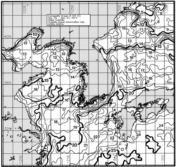 ◦ 금주(2014. 11. 25~2014. 12. 01)의 한국근해 표면수온은 대화퇴 근해 15~16도, 울릉도-독도 근해 16~17도, 대마도 근해 20~21도, 제주도 근해 19~20도, 이어도 근해 18~19도, 가거초 근해 16~17도, 어청도 근해 14~15도, 백령도 근해 12∼13도로 나타납니다. ◦ 「평년에 비해」대화퇴 근해 2도 높게, 울릉도-독도 근해 비슷하게, 대마도 근해 0.5도 높게, 제주도 근해 비슷하게, 이어도 근해 비슷하게, 가거초 근해 1.4도 높게, 어청도 근해 1.1도 높게 나타납니다. ◦「전년에 비해」대화퇴 근해 4도 높게, 울릉도-독도 근해 1도 낮게, 대마도 근해 0.5도 높게, 제주도 근해 1도 높게, 이어도 근해 1도 높게, 가거초 근해 2도 높게, 어청도 근해 2도 높게, 백령도 근해 1.5도 높게 나타납니다. ◦ 수온 전선대는 우리나라 제주해협에서 대한해협까지 20도를 중심으로 형성됩니다. |
