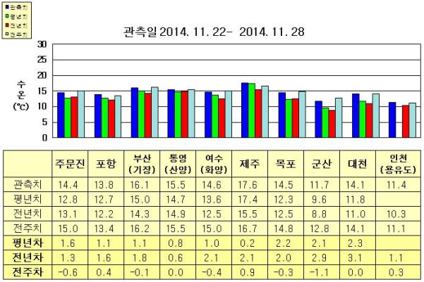 ◦ 금주(2014. 11. 22~2014. 11. 28)의 한반도 연안 표면수온은 동해 연안역에서 섭씨 13.5~16.5도, 남해 연안역 14.5~18.0도, 서해 연안역에서 11.0~14.5도로 나타납니다. ◦ 평년에 비해 동해 연안역은 1~2도 높게, 제주 비슷함을 제외한 남해 연안역은 0.5~1.0도 높게, 서해 연안역은 2.0~2.5도 높게 나타납니다. ◦ 전년에 비해 동해 연안역은 1~2도 높게, 남해 연안역은 0.5~2.5도 높게, 서해 연안역은 1.0~3.5도 높게 나타납니다. |