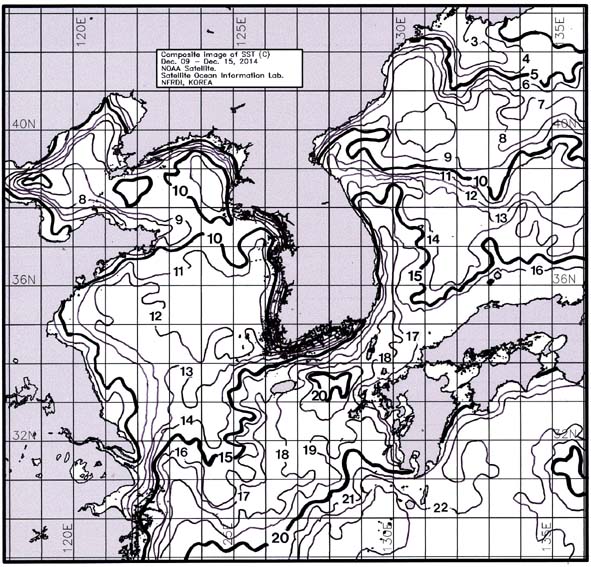 ◦ 금주(2014. 12. 09~2014. 12. 15)의 한국근해 표면수온은 대화퇴 근해 10~11도, 울릉도-독도 근해 14~15도, 대마도 근해 18~19도, 제주도 근해 16~18도, 이어도 근해 15~16도, 가거초 근해 13~14도, 어청도 근해 10~12도, 백령도 근해 10∼11도로 나타납니다. ◦ 「평년에 비해」대화퇴 근해 0.4도 낮게, 울릉도-독도 근해 1.2도 낮게, 대마도 근해 비슷하게, 제주도 근해 1도 낮게, 이어도 근해 0.5도 낮게, 가거초 근해 비슷하게, 어청도 근해 비슷하게 나타납니다. ◦「전년에 비해」대화퇴 근해 1도 높게, 울릉도-독도 근해 비슷하게, 대마도 근해 비슷하게, 제주도 근해 0.5도 낮게, 이어도 근해 비슷하게, 가거초 근해 1도 낮게, 어청도 근해 0.5도 높게, 백령도 근해 1도 높게 나타납니다. ◦ 수온 전선대는 우리나라 제주해협에서 대한해협까지 17도를 중심으로 형성됩니다. |