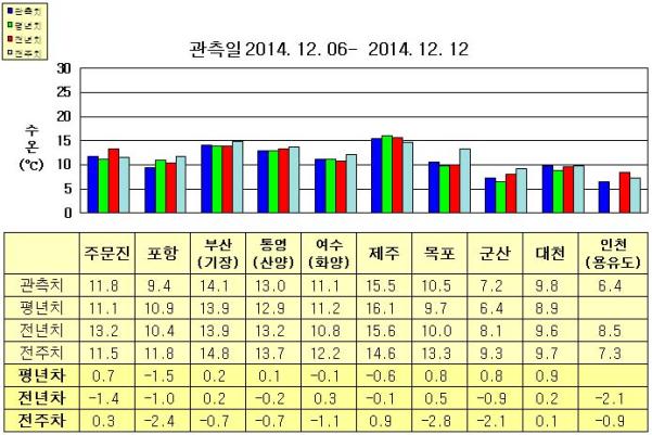 ◦ 금주(2014. 12. 06~2014. 12. 12)의 한반도 연안 표면수온은 동해 연안역에서 섭씨 9.0~14.5도, 남해 연안역 11.0~15.5도, 서해 연안역에서 6.0~10.5도로 나타납니다. ◦ 평년에 비해 동해 연안역은 주문진 0.7도 높게, 포항 1.5도 낮게, 부산(기장) 비슷하게, 제주 0.6도 낮음을 제외한 남해 연안역은 비슷하게, 서해 연안역은 0.5.~1.0도 높게 나타납니다. ◦ 전년에 비해 부산(기장) 비슷함을 제외한 동해 연안역은 1.0~1.5도 낮게, 남해 연안역은 비슷하게, 대천 비슷함, 목포 0.5도 높음을 제외한 서해 연안역은 0.5~2.5도 낮게 나타납니다. |