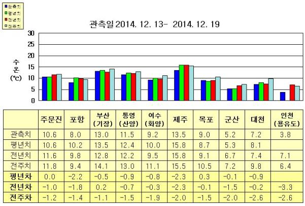 ◦ 금주(2014. 12. 13~2014. 12. 19)의 한반도 연안 표면수온은 동해 연안역에서 섭씨 8~13도, 남해 연안역 9.0~13.5도, 서해 연안역에서 3.5~9.0도로 나타납니다. ◦ 평년에 비해 주문진 비슷함을 제외한 동해 연안역은 0.5~2.5도 낮게, 남해 연안역은 0.5~2.5도 낮게, 대천 0.9도 낮음을 제외한 서해 연안역은 비슷하게 나타납니다. ◦ 전년에 비해 부산(기장) 비슷함을 제외한 동해 연안역은 1~2도 낮게, 여수(화양) 비슷함을 제외한 남해 연안역은 0.5~2.5도 낮게, 군산 1.5도, 인천(용유도) 3.3도 낮음을 제외한 서해 연안역은 비슷하게 나타납니다. |