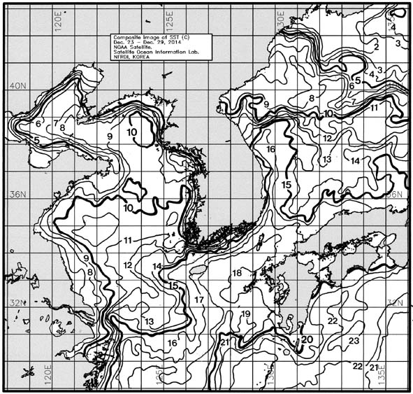 ◦ 금주(2014. 12. 23~2014. 12. 29)의 한국근해 표면수온은 대화퇴 근해 9~11도, 울릉도-독도 근해 14~16도, 대마도 근해 17~19도, 제주도 근해 17~18도, 이어도 근해 12~13도, 가거초 근해 11~13도, 어청도 근해 9~11도, 백령도 근해 9∼10도로 나타납니다. ◦ 「평년에 비해」대화퇴 근해 0.6도 낮게, 울릉도-독도 근해 0.5도 높게, 대마도 근해 비슷하게, 제주도 근해 비슷하게, 이어도 근해 2도 낮게, 가거초 근해 0.8도 낮게, 어청도 근해 0.6도 높게 나타납니다. ◦「전년에 비해」대화퇴 근해 3.5도 높게, 울릉도-독도 근해 0.5도 높게, 대마도 근해 비슷하게, 제주도 근해 1.5도 높게, 이어도 근해 1도 높게, 가거초 근해 0.5도 높게, 어청도 근해 0.5도 높게, 백령도 근해 0.5도 높게 나타납니다. ◦ 수온 전선대는 우리나라 제주해협에서 대한해협까지 17도를 중심으로 형성됩니다. =$row['content']?> =$row['content']?> =$row['content']?> |