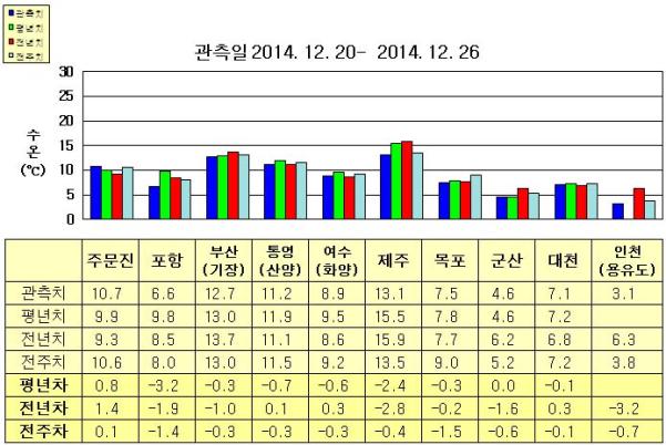 ◦ 금주(2014. 12. 20~2014. 12. 26)의 한반도 연안 표면수온은 동해 연안역에서 섭씨 6.5~13도, 남해 연안역 8.5~13.5도, 서해 연안역에서 3.0~7.5도로 나타납니다. ◦ 평년에 비해 동해 연안역은 주문진 0.8도 높게, 포항 3.2도 낮게, 부산(기장) 비슷하게, 남해 연안역은 0.5~3.0도 낮게, 서해 연안역은 비슷하게 나타납니다. ◦ 전년에 비해 주문진 1.4도 높음을 제외한 동해 연안역은 1~2도 낮게, 제주 2.8도 낮음을 제외한 남해 연안역은 비슷하게, 군산 1.6도, 인천(용유도) 3.2도 낮음을 제외한 서해 연안역은 비슷하게 나타납니다. =$row['content']?> =$row['content']?> =$row['content']?> |