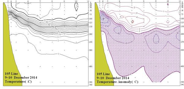 ◦ 2014년 12월 9∼10일 국립수산과학원 동해수산연구소에서 조사한 105 선(동해 동방)의 수직수온분포도 및 평년편차도입니다. ◦ 10℃를 중심으로 수온약층이 형성되었으며, 연안에서 외해로 갈수록 수 온약층 형성수심이 깊어졌습니다. ◦ 평년에 비하여, 표층 혼합층에서는 1∼5℃ 범위의 고온현상를 보였고, 그 이외의 관측해역에서는 1∼4℃ 범위의 저온현상을 보였습니다. =$row['content']?> =$row['content']?> =$row['content']?> |