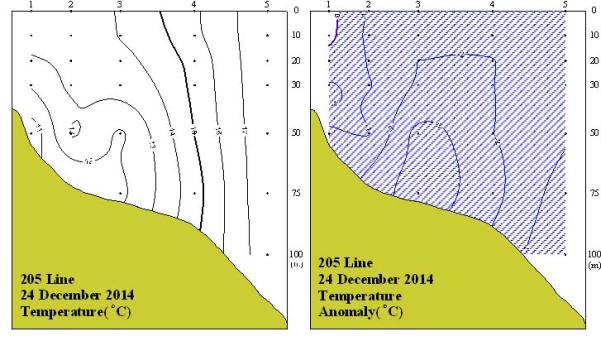 ◦ 2014년 12월 24일 국립수산과학원 남서해수산연구소에서 조사한 205선 (소리도 남동방)의 수직수온분포도 및 평년편차도 입니다. ◦ 수온은 연직적으로 거의 균일한 양상을 보였으며, 연안역에서 외해역으 로 갈수록 수온이 상승하는 경향을 나타내었습니다. ◦ 평년에 비하여 전체 관측해역에서 1∼4℃ 범위의 저온현상을 보였습니 다. =$row['content']?> =$row['content']?> =$row['content']?> |