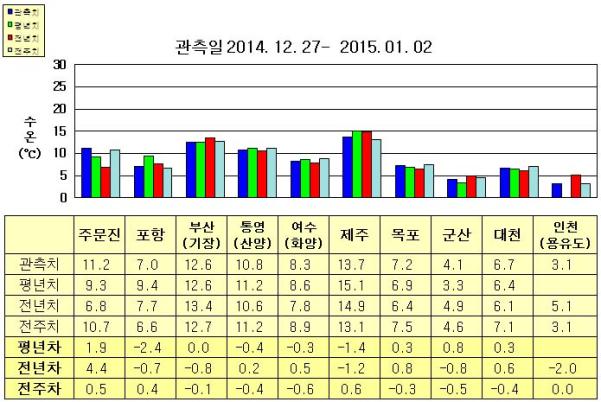 ◦ 금주(2014. 12. 27~2015. 01. 02)의 한반도 연안 표면수온은 동해 연안역에서 섭씨 7~13도, 남해 연안역 8~14도, 서해 연안역에서 3.0~7.5도로 나타납니다. ◦ 평년에 비해 동해 연안역은 주문진 1.9도 높게, 포항 2.4도 낮게, 부산(기장) 비슷하게, 여수(화양) 비슷함을 제외한 남해 연안역은 0.5~1.5도 낮게, 군산 0.8도 높음을 제외한 서해 연안역은 비슷하게 나타납니다. ◦ 전년에 비해 주문진 4.4도 높음을 제외한 동해 연안역은 0.5~1.0도 낮게, 남해 연안역은 통영(산양) 비슷하게, 여수(화양) 0.5도 높게, 제주 1.2도 낮게, 목포 0.8도, 대천 0.6도 높음을 제외한 서해 연안역은 0.5~2.0도 낮게 나타납니다. |