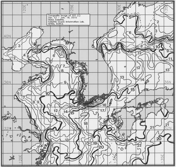 ◦ 금주(2015. 01. 13~2015. 01. 19)의 한국근해 표면수온은 대화퇴 근해 7~8도, 울릉도-독도 근해 13~14도, 대마도 근해 16~17도, 제주도 근해 16~17도, 이어도 근해 12~13도, 가거초 근해 12~14도, 어청도 근해 8~9도, 백령도 근해 5∼7도로 나타납니다. ◦ 「평년에 비해」대화퇴 근해 1.5도 낮게, 울릉도-독도 근해 0.8도 높게, 대마도 근해 비슷하게, 제주도 근해 0.5도 높게, 이어도 근해 비슷하게, 가거초 근해 1.4도 높게, 어청도 근해 0.8도 높게 나타납니다. ◦「전년에 비해」대화퇴 근해 비슷하게, 울릉도-독도 근해 1도 높게, 대마도 근해 0.5도 높게, 제주도 근해 1도 높게, 이어도 근해 1도 높게, 가거초 근해 1도 높게, 어청도 근해 1도 높게, 백령도 근해 0.5도 낮게 나타납니다. ◦ 수온 전선대는 우리나라 제주해협에서 대한해협까지 16도를 중심으로 형성됩니다. |