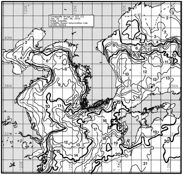 ◦ 금주(2015. 01. 20~2015. 01. 26)의 한국근해 표면수온은 대화퇴 근해 8~9도, 울릉도-독도 근해 12~13도, 대마도 근해 15~16도, 제주도 근해 15~16도, 이어도 근해 11~12도, 가거초 근해 9~11도, 어청도 근해 6~7도, 백령도 근해 6∼7도로 나타납니다. ◦ 「평년에 비해」대화퇴 근해 0.8도 높게, 울릉도-독도 근해 0.9도 높게, 대마도 근해 비슷하게, 제주도 근해 0.6도 높게, 이어도 근해 0.5도 높게, 가거초 근해 0.5도 낮게, 어청도 근해 비슷하게 나타납니다. ◦「전년에 비해」대화퇴 근해 2.5도 높게, 울릉도-독도 근해 비슷하게, 대마도 근해 0.5도 낮게, 제주도 근해 비슷하게, 이어도 근해 2도 높게, 가거초 근해 2.5도 낮게, 어청도 근해 비슷하게, 백령도 근해 비슷하게 나타납니다. ◦ 수온 전선대는 우리나라 제주해협에서 대한해협까지 15도를 중심으로 형성됩니다. =$row['content']?> =$row['content']?> =$row['content']?> |