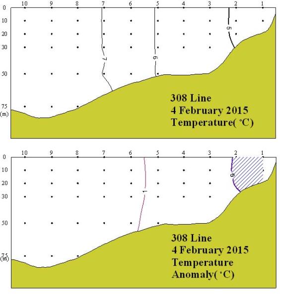 ◦ 평년에 비하여 정점 1∼2사이에서 1℃ 내외의 저온현상을 보였으며,