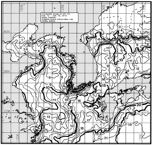◦ 금주(2015. 02. 10~2015. 02. 16)의 한국근해 표면수온은 대화퇴 근해 5~6도, 울릉도-독도 근해 11~12도, 대마도 근해 15~16도, 제주도 근해 14~16도, 이어도 근해 10~11도, 가거초 근해 9~11도, 어청도 근해 7~8도, 백령도 근해 4∼5도로 나타납니다. ◦ 「평년에 비해」대화퇴 근해 1.1도 낮게, 울릉도-독도 근해 1.2도 높게, 대마도 근해 0.8도 높게, 제주도 근해 0.5도 높게, 이어도 근해 0.9도 높게, 가거초 근해 비슷하게, 어청도 근해 2.1도 높게 나타납니다. ◦「전년에 비해」대화퇴 근해 0.5도 높게, 울릉도-독도 근해 0.5도 높게, 대마도 근해 1.5도 높게, 제주도 근해 0.5도 높게, 이어도 근해 1도 낮게, 가거초 근해 2.5도 낮게, 어청도 근해 1도 높게, 백령도 근해 비슷하게 낮게 나타납니다. ◦ 수온 전선대는 우리나라 제주해협에서 대한해협까지 14도를 중심으로 형성됩니다. |