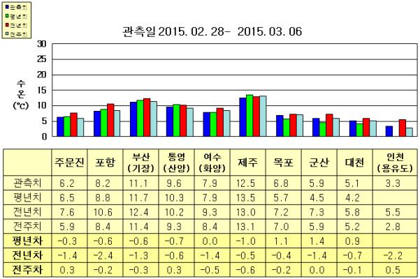◦ 금주(2015. 02. 28~2015. 03. 06)의 한반도 연안 표면수온은 동해 연안역에서 섭씨 6.0~11.5도, 남해 연안역 7.5~12.5도, 서해 연안역에서 3~7도로 나타납니다. ◦ 평년에 비해 주문진 비슷함을 제외한 동해 연안역은 0.5~1.0도 낮게, 여수(화양) 비슷함을 제외한 남해 연안역은 0.5~1.0도 낮게, 서해 연안역은 0.5~1.5도 높게 나타납니다. ◦ 전년에 비해 동해 연안역은 1.0~2.5도 낮게, 남해 연안역은 0.5~1.5도 낮게, 서해 연안역은 0.5~2.5도 낮게 나타납니다. |