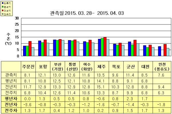 ◦ 금주(2015. 03. 28~2015. 04. 03)의 한반도 연안 표면수온은 동해 연안역에서 섭씨 8~13도, 남해 연안역 11.5~13.5도, 서해 연안역에서 7.5~11.5도로 나타납니다. ◦ 평년에 비해 주문진 비슷함을 제외한 동해 연안역은 0.5~1.5도 높게, 제주 낮음을 제외한 남해 연안역은 0.5~1.0도 높게, 서해 연안역은 0.5~2.5도 높게 나타납니다. ◦ 전년에 비해 부산(기장) 비슷함을 제외한 동해 연안역은 0.5~4.0도 낮게, 통영(산양) 비슷함을 제외한 남해 연안역은 1~2도 낮게, 대천 비슷함을 제외한 서해 연안역은 0.5~2.0도 낮게 나타납니다. |
