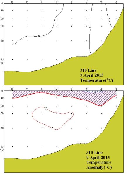 ◦ 2015년 4월 9일 국립수산과학원 서해수산연구소에서 조사한 310선 (영광 서방)의 수직수온분포도 및 평년편차도입니다. ◦ 관측해역 내에서 수온약층은 형성되지 않았고, 7~8℃의 수온분포를 보였습니다. 보였으며, 이를 제외한 대부분의 해역에서 1℃ 내외의 고온분포를 보였습니다. =$row['content']?>=$row['content']?> =$row['content']?> |