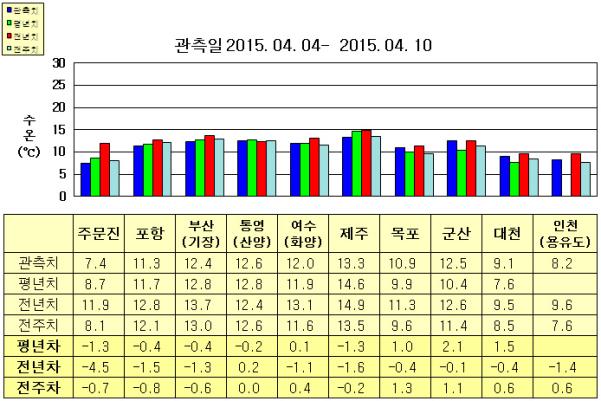 ◦ 금주(2015. 04. 04~2015. 04. 10)의 한반도 연안 표면수온은 동해 연안역에서 섭씨 7.0~12.5도, 남해 연안역 12.0~13.5도, 서해 연안역에서 8.0~12.5도로 나타납니다. ◦ 평년에 비해 동해 연안역은 0.5~1.5도 낮게, 제주 1.3도 낮음을 제외한 남해 연안역은 비슷하게, 서해 연안역은 1.0~2.5도 높게 나타납니다. ◦ 전년에 비해 동해 연안역은 1.0~4.5도 낮게, 통영(산양) 비슷함을 제외한 남해 연안역은 1~2도 낮게, 군산 비슷함을 제외한 서해 연안역은 0.5~1.5도 낮게 나타납니다. |