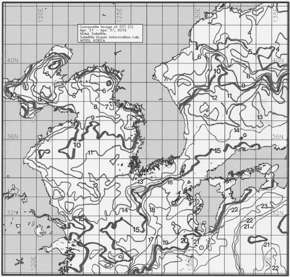 ◦ 금주(2015. 04. 21~2015. 04. 27)의 한국근해 표면수온은 대화퇴 근해 8~9도, 울릉도-독도 근해 12~13도, 대마도 근해 14~16도, 제주도 근해 14~15도, 이어도 근해 14~15도, 가거초 근해 12~13도, 어청도 근해 9~10도, 백령도 근해 6∼7도로 나타납니다. ◦ 「평년에 비해」대화퇴 근해 0.5도 낮게, 울릉도-독도 근해 비슷하게, 대마도 근해 0.6도 낮게, 제주도 근해 0.5도 낮게, 이어도 근해 2.2도 높게, 가거초 근해 1.8도 높게, 어청도 근해 0.9도 높게 나타납니다. ◦「전년에 비해」대화퇴 근해 1.5도 낮게, 울릉도-독도 근해 2도 낮게, 대마도 근해 1도 낮게, 제주도 근해 1도 낮게, 이어도 근해 2도 높게, 가거초 근해 1도 높게, 어청도 근해 1도 높게, 백령도 근해 비슷하게 나타납니다. ◦ 수온 전선대는 우리나라 제주해협에서 대한해협까지 14도를 중심으로 형성됩니다. =$row['content']?> =$row['content']?> =$row['content']?> |