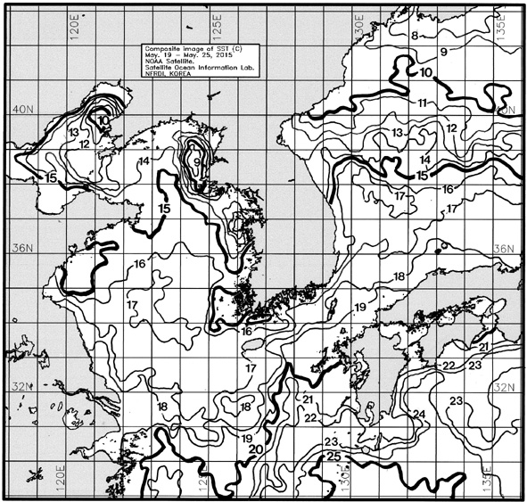 ◦ 금주(2015. 05. 19~2015. 05. 25)의 한국근해 표면수온은 대화퇴 근해 11~13도, 울릉도-독도 근해 16~17도, 대마도 근해 17~19도, 제주도 근해 16~18도, 이어도 근해 16~18도, 가거초 근해 15~16도, 어청도 근해 14~15도, 백령도 근해 10∼11도로 나타납니다. ◦ 「평년에 비해」대화퇴 근해 1도 낮게, 울릉도-독도 근해 0.7도 높게, 대마도 근해 0.4도 낮게, 제주도 근해 0.7도 낮게, 이어도 근해 비슷하게, 가거초 근해 비슷하게, 어청도 근해 0.4도 높게 나타납니다. ◦「전년에 비해」대화퇴 근해 2도 높게, 울릉도-독도 근해 비슷하게, 대마도 근해 1.5도 낮게, 제주도 근해 3도 낮게, 이어도 근해 0.5도 높게, 가거초 근해 1도 낮게, 어청도 근해 0.5도 낮게, 백령도 근해 2.5도 낮게 나타납니다. ◦ 수온 전선대는 우리나라 제주해협에서 대한해협까지 17도를 중심으로 형성됩니다. |