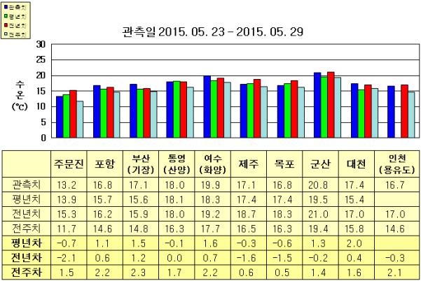 ◦ 금주(2015. 05. 23~2015. 05. 29)의 한반도 연안 표면수온은 동해 연안역에서 섭씨 13.0~17.5도, 남해 연안역 17~20도, 서해 연안역에서 16.5~21.0도로 나타납니다. ◦ 평년에 비해 주문진 0.7도 낮음을 제외한 동해 연안역은 1.0~1.5도 높게, 여수(화양) 1.6도 높음을 제외한 남해 연안역은 비슷하게, 목포 0.6도 낮음을 제외한 서해 연안역은 1~2도 높게 나타납니다. ◦ 전년에 비해 주문진 2.1도 낮음을 제외한 동해 연안역은 0.5~1.5도 높게, 남해 연안역은 통영(산양) 비슷하게, 여수(화양) 0.7도 높게, 제주 1.6도 낮게, 목포 1.5도 낮음, 대천 0.4도 높음을 제외한 서해 연안역은 비슷하게 나타납니다. |