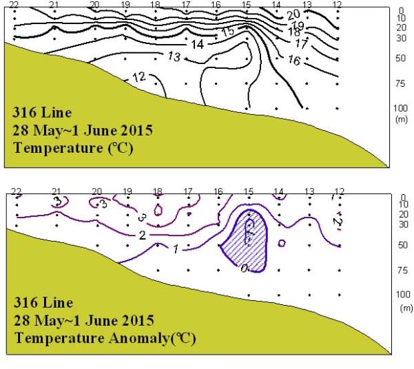 ◦ 201552861일 국립수산과학원 남서해수산연구소에서 조사한 동중국해 북부해역(316)의 수온 수직분포도와 평년편차도입니다.