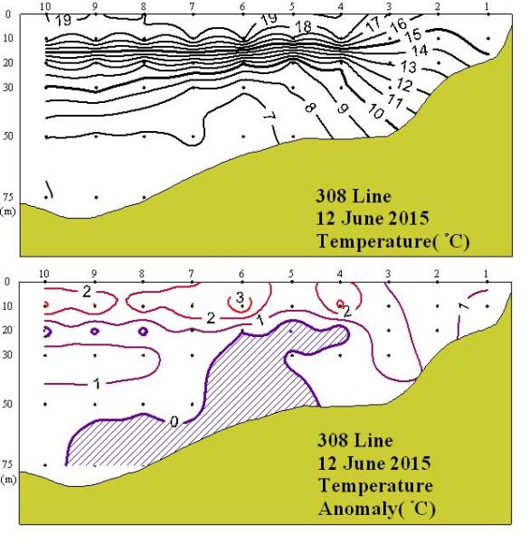 ◦ 2015년 6월 12일 국립수산과학원 서해수산연구소에서 조사한 308선(대천 서방)의 수직수온분포도 및 평년편차도입니다. ◦ 수온약층은 수심 10∼30m 사이에서 14℃를 중심으로 강하게 형성되었고, 정점 4를 기준으로 연안부근에 조석에 의한 연직혼합으로 성층약화가 보였습니다. ◦ 평년에 비하여 정점 4∼9사이에서 수심 30m 이하부근에서 1℃내외의 저온현상 을 보였고, 나머지 대부분의 해역에서 1∼3℃ 범위의 고온현상을 보였습니다. =$row['content']?>=$row['content']?> =$row['content']?> |