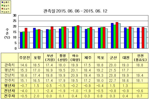 ◦ 금주(2015. 06. 06~2015. 06. 12)의 한반도 연안 표면수온은 동해 연안역에서 섭씨 14.5~18.5도, 남해 연안역 17.5~20.0도, 서해 연안역에서 18.5~23.0도로 나타납니다. ◦ 평년에 비해 주문진 0.7도 낮음을 제외한 동해 연안역은 0.5~1.5도 높게, 여수(화양) 비슷함을 제외한 남해 연안역은 0.5~1.5도 낮게, 목포 0.4도 낮음을 제외한 서해 연안역은 1.0~1.5도 높게 나타납니다. ◦ 전년에 비해 포항 1.1도 높음을 제외한 동해 연안역은 2~4도 낮게, 남해 연안역은 1~2도 낮게, 서해 연안역은 0.5~1.0도 낮게 나타납니다. |