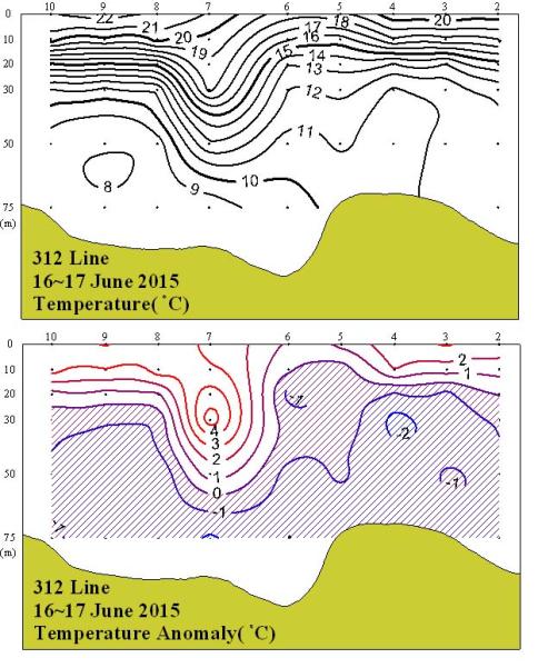 =$row['content']?> ◦ 2015년 6월 16∼17일 국립수산과학원 서해수산연구소에서 조사한 312선 (제주해협 서방)의 수직수온분포도 및 평년편차도입니다. ◦ 수온약층은 수심 10∼30m 사이에서 15℃를 중심으로 형성되었습니다. ◦ 평년에 비하여 표층에서 수심 30m 사이에서 1∼4℃ 범위의 고온현상을 나타내었고, 수심 30m이하에서는 1∼2℃ 범위의 저온현상을 나타내었습니다. =$row['content']?> =$row['content']?> |