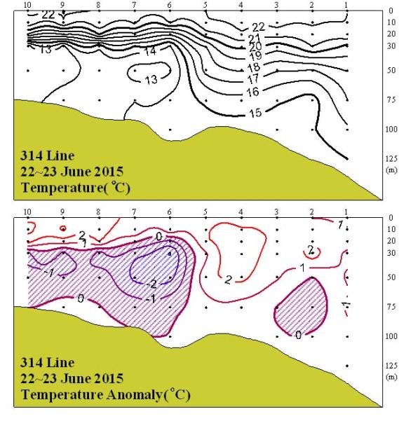 =$row['content']?> ◦ 2015년 6월 22~23일 국립수산과학원 남서해수산연구소에서 조사한 314선(제주 남부해역)의 수직수온분포도 및 평년편차도 입니다. ◦ 수온약층은 수심 10~30m 부근에서 형성되었으며, 제주 남동해역으로 갈수록 약하게 형성되었습니다. ◦ 평년에 비하여 정점 6~10 사이의 수심 20m 이하에서 1~2℃ 범위의 저온현상을 보였으며, 이를 제외한 대부분의 해역에서 1~2℃ 범위의 고온현상을 보였습니다. =$row['content']?> =$row['content']?> |