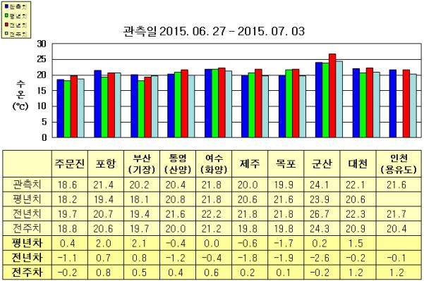 ◦ 금주(2015. 06. 27~2015. 07. 03)의 한반도 연안 표면수온은 동해 연안역에서 섭씨 18.5~21.5도, 남해 연안역 20~22도, 서해 연안역에서 19.5~24.5도로 나타납니다.