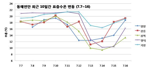 ◦ 태풍 관련 동해연안 수온 급하강 정보(해양자료속보 제4702호, 2015.7.13.) 및 동해 연안 수온 변동 정보(해양자료속보 제 4705호, 2015.7.15.)와 관련임. ◦ 국립수산과학원에서 설치 운영하고 있는 실시간 어장환경정보시스템 관측 자료의 분석 결과, 동해연안의 최근 10일간 수온 변동은 아래와 같음 (7월 7∼16일). ◦ 2015년 제 9호 태풍 찬홈의 통과후 해수의 연직혼합으로 수온이 급하강 하였으나, 빠른 속도로 수온이 회복되는 단계에 있음. ◦ 그 결과, 동해 연안은 9호 태풍 통과후 4∼10℃까지 하강하였던 수온이 다시 4∼8℃ 급상승하는 경향을 나타냄. - 태풍통과에 따른 수온 변화 (7.10→7.14→7.16) : 양양 19℃→12℃→19℃, 강릉 20℃→ 11℃→19℃, 삼척 20℃→9℃→13℃, 영덕 21℃→10℃→16℃, 기장 21℃→16℃→19℃