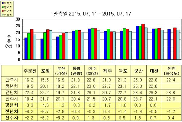 ◦ 금주(2015. 07. 11~2015. 07. 17)의 한반도 연안 표면수온은 동해 연안역에서 섭씨 15.5~17.0도, 남해 연안역 21~23도, 서해 연안역에서 21~25도로 나타납니다.