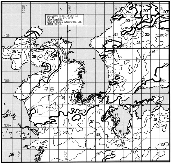 ◦ 금주(2015. 07. 21~2015. 07. 27)의 한국근해 표면수온은 대화퇴 근해 23~24도, 울릉도-독도 근해 23~24도, 대마도 근해 24~26도, 제주도 근해 24~26도, 이어도 근해 25~26도, 가거초 근해 24~25도, 어청도 근해 23~24도, 백령도 근해 22∼23도로 나타납니다.