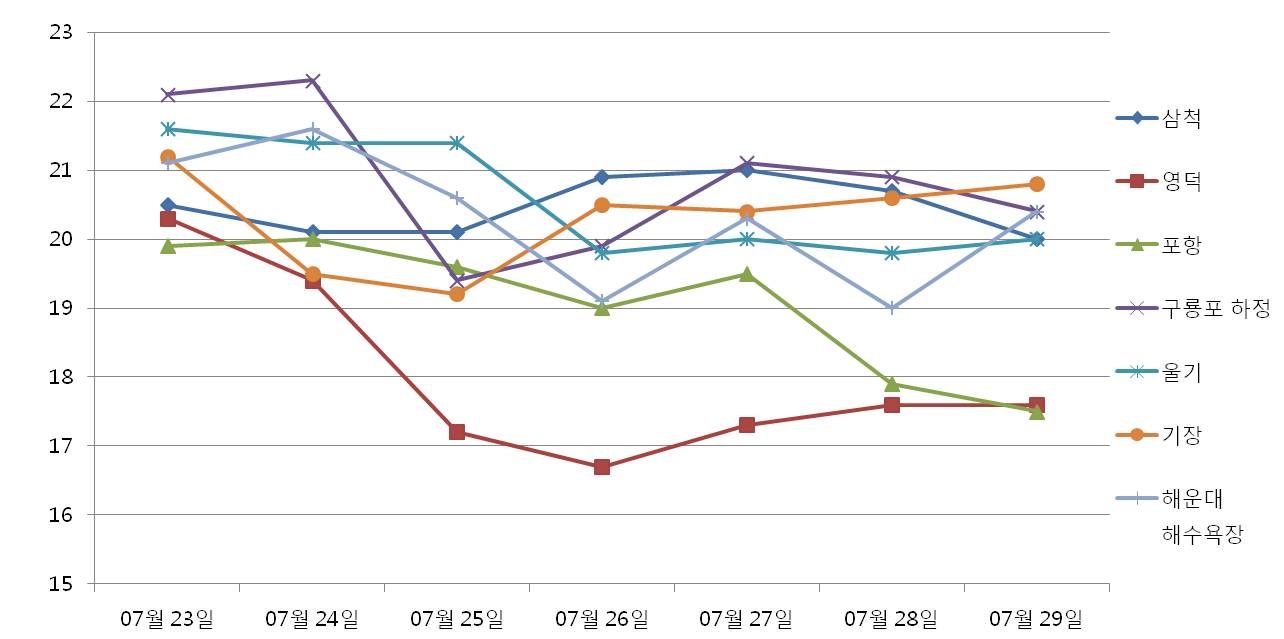 ◦ 국립수산과학원 실시간 관측정보 시스템, 연안정지, 해양관측부이 등에서 관측한 동해 연안역의 최근 7일 (7월 23일∼7월 29일)의 수온 변화를 나타냄. ◦ 표층수온은 7월 29일 10시 현재 삼척 20.0℃, 영덕 17.6℃, 포항 17.5℃, 구룡포 하정 20.4℃, 울기 20.0℃, 기장 20.8℃, 해운대 해수욕장 20.4도로 나타나며, 특히 영덕, 포항 연안은 주변 연안에 비해 3℃ 정도 낮게 나타나기 시작함. ◦ 냉수대발생이 예측되오니 수온의 급변동에 따름 양식생물의 폐사와 연안어업 어획량의 감소뿐 만 아니라 연안에 짙은 해무가 발생해 선박 안전사고가 발생되지 않도록 각별한 주의바람. ※ 붙임 참조(냉수대 발생 및 태풍 통과에 따른 어업인 대처요령).