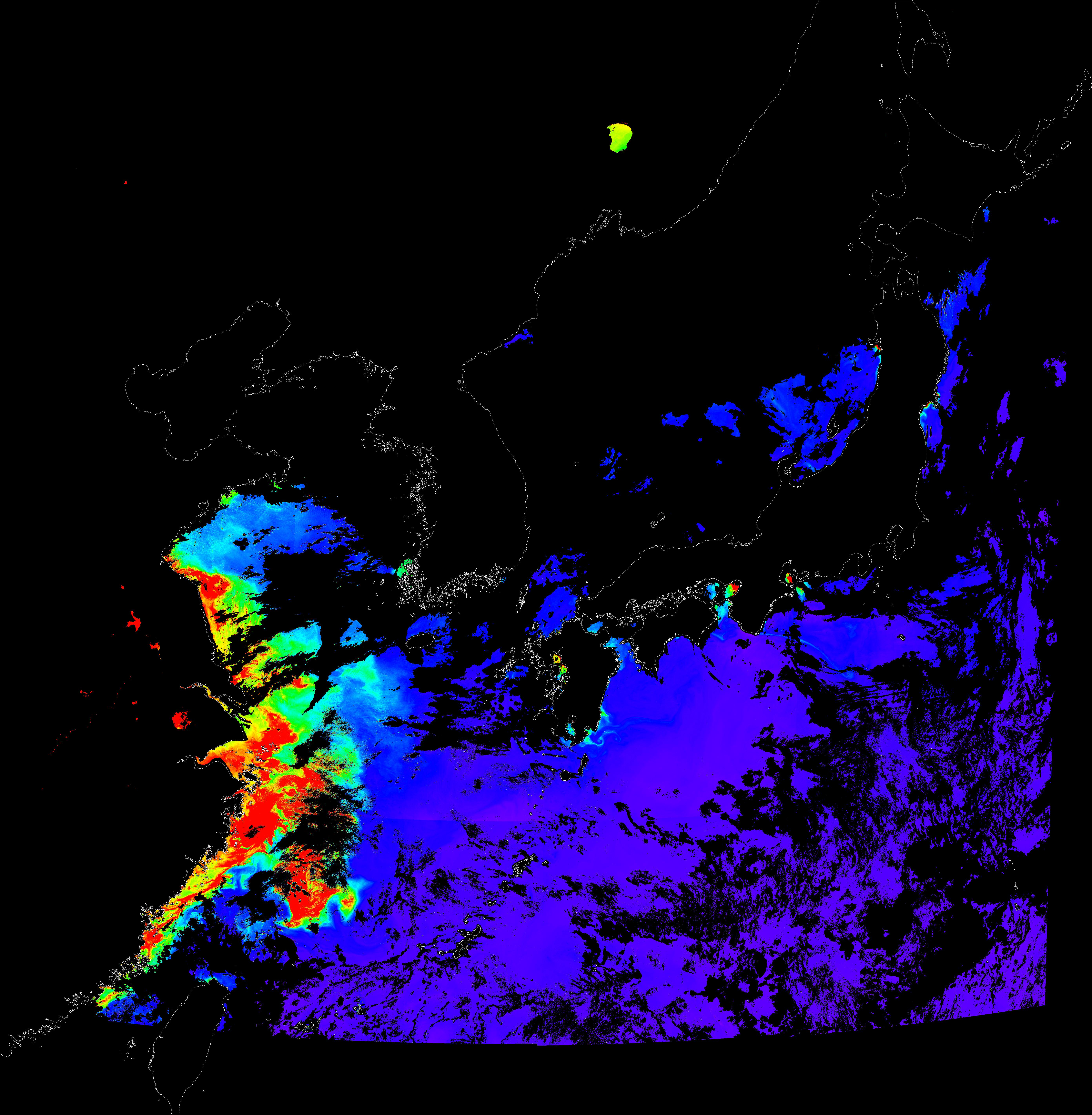 o 2015년 7월 29일 천리안 GOCI 클로로필 a 위성영상입니다.