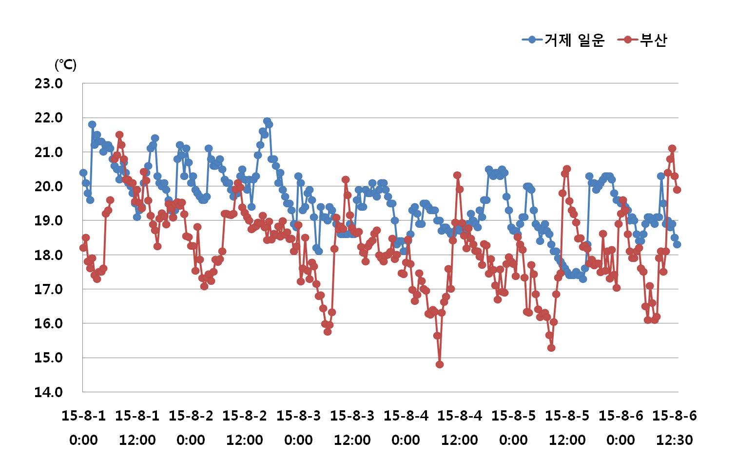 ◦ 2015년 8월6일 15시를 기해 울기, 부산, 거제 일운 연안에 냉수대 주의보를 발령합니다. ◦ 아래 그림은 해양자료센터 및 한국수력원자력 실시간 관측정보에서 관측한 최근 6일(8월 1일∼8월 6일)의 수온 변화를 나타냅니다.