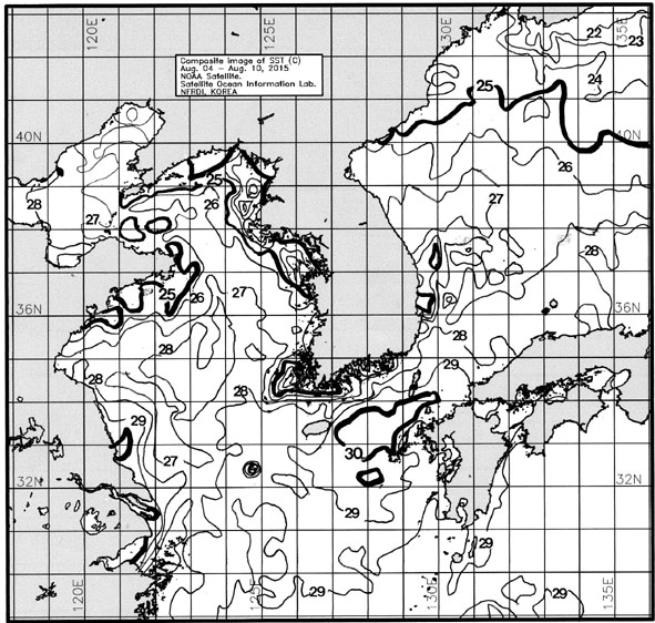 ◦ 금주(2015. 08. 04~2015. 08. 10)의 한국근해 표면수온은 대화퇴 근해 25~26도, 울릉도-독도 근해 26~28도, 대마도 근해 28~29도, 제주도 근해 28~29도, 이어도 근해 28~29도, 가거초 근해 27~28도, 어청도 근해 26~27도, 백령도 근해 22∼23도로 나타납니다.