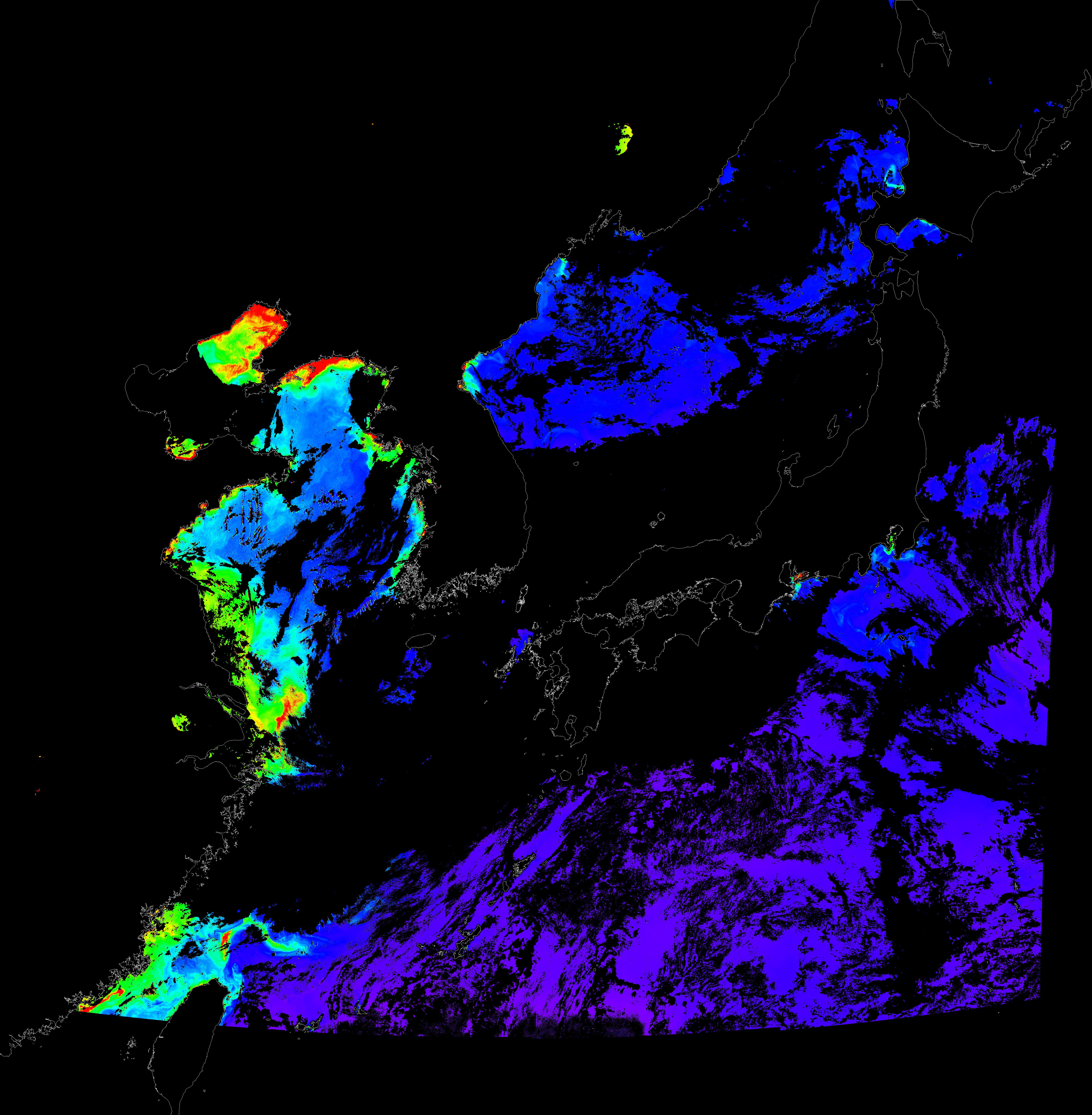 o 2015년 8월 12일 천리안 GOCI 클로로필 a 위성영상입니다.