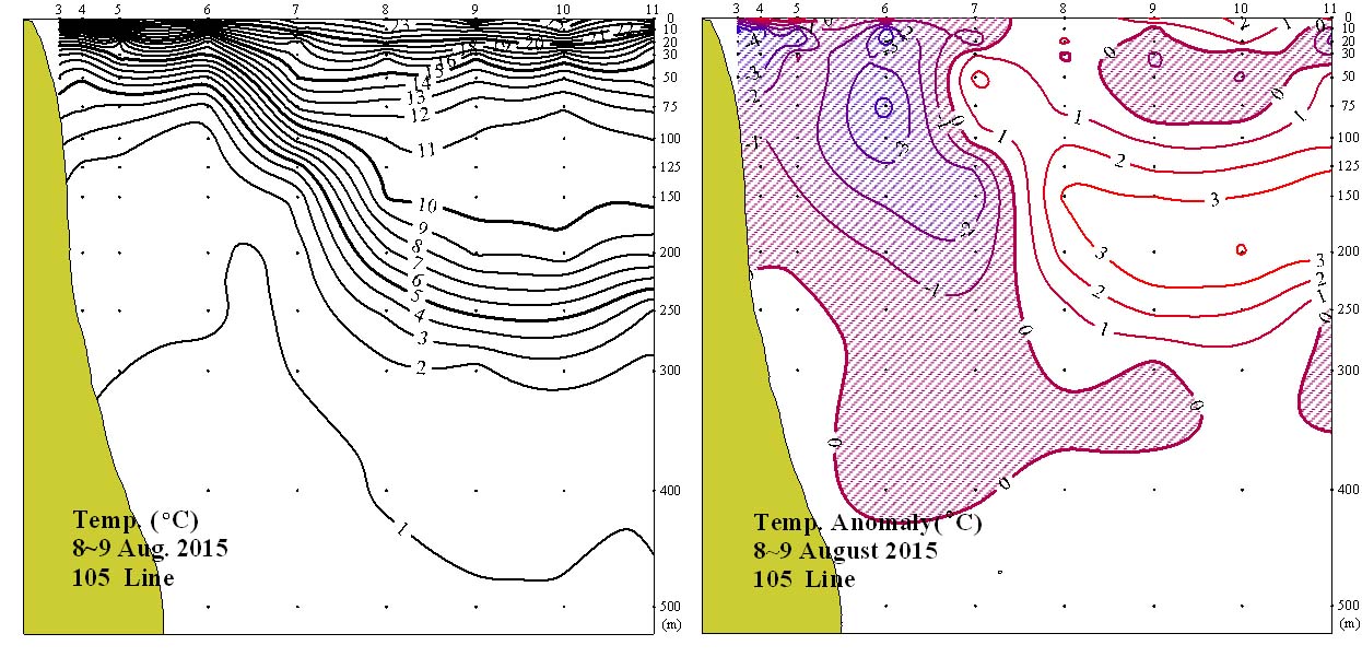 ◦ 2015년 8월 8~9일 국립수산과학원 동해수산연구소에서 조사한 105선 (동해 동방)의 수직수온분포도 및 평년편차도입니다. ◦ 관측해역 내에서 정점 7∼11사이에서 수심 10∼30m 사이에서 20℃를 중심으로 계절수온약층이 형성되었고, 수심 150∼300m 사이에서 6℃를 중심으로 영구수온약층이 형성되었습니다. ◦ 평년에 비하여 정점 3~7사이 표층부터 수심 400m까지와 정점 9~11사이 10m~ 수심 75m 사이에서 1~4℃ 범위의 저온현상을 보였고, 나머지 해역에서는 1~3℃ =$row['content']?> =$row['content']?> =$row['content']?> |