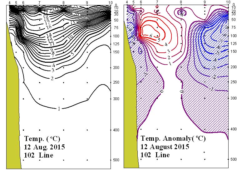 ◦ 2015년 8월 12일 국립수산과학원 동해수산연구소에서 조사한 102선(포항 동 방) 의 수직수온분포도 및 평년편차도 입니다. ◦ 관측해역 내에서 수심 10∼30m 사이에서 23℃를 중심으로 계절수온약층 이 형성되었고, 수심 30∼200m 사이에서 10℃를 중심으로 영구수온약층 이 형성되었습니다. ◦ 평년에 비하여 정점 4∼6 사이의 연안역 부근과 정점 8∼10 사이의 중층에서 1∼9℃ 범위의 저온현상을 보였고, 나머지 관측해역에서는 1∼6℃ 범위의 고온현상을 보였습니다. |