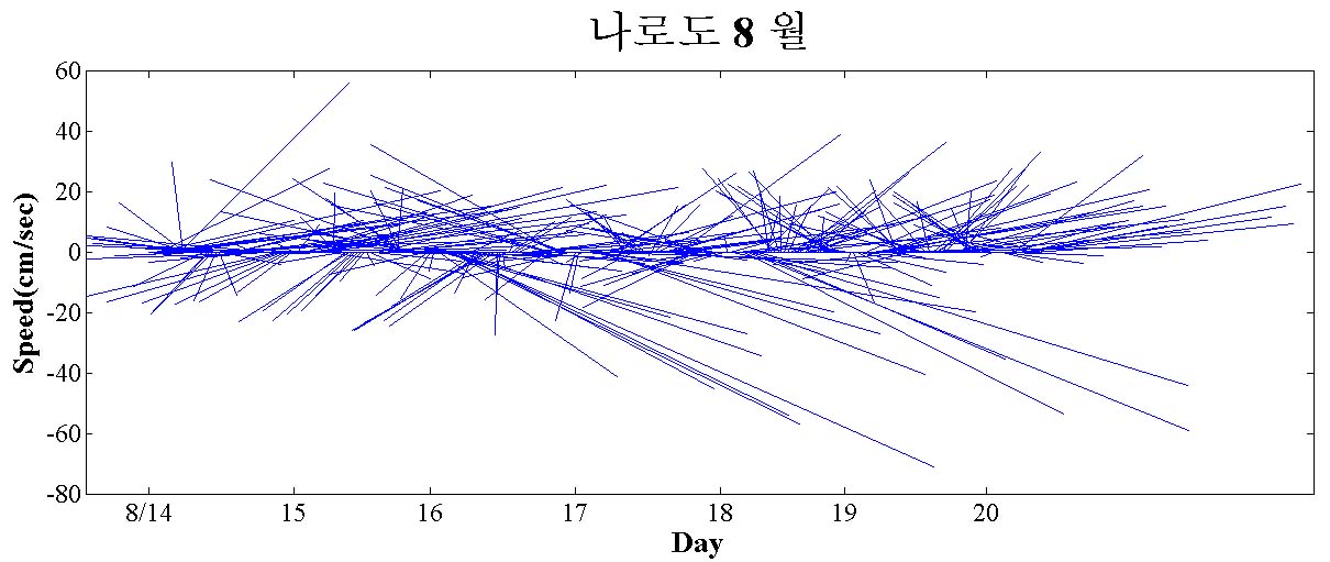 ◦ 국립수산과학원에서는 유해적조에 의한 피해 최소화를 위하여 전남 고흥군 외나로도 남방에 해양기상관측부이를 운영하고 있으며, 관측부이에는 기온, 기압, 풍향/풍속 등 기상요소와 수온, 염분, 용존산소, 클로로필, 유향/유속 등 해양요소를 동시에 측정하고 있습니다. ◦ 관측부이가 설치되어 있는 지역은 조류(tidal current)가 우세한 지역이라 전반적으로 동남류가 우세하며, 8월 14일∼20일 중 최대유속은 174.7(cm/s)이며, 최저유속은 0.5(cm/s)입니다.