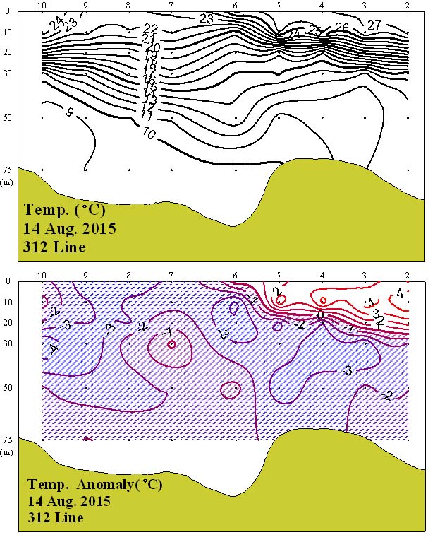 ◦ 2015년 8월 14일 국립수산과학원 서해수산연구소에서 조사한 312선 (제주해협 서방)의 수직수온분포도 및 평년편차도입니다. ◦ 관측해역 내에서 수심 10~50m 사이에서 수온약층이 형성되었고, 9∼27℃의수온분포를 보였습니다. ◦ 평년에 비하여 정점 2~6 사이의 표층~수심 20m 사이에서 1~4℃ 범위의 고온현상을 보였고, 그 밖의 대부분의 해역에서 1~4℃ 범위의 저온현상을 보였습니다. =$row['content']?> =$row['content']?> =$row['content']?> |
