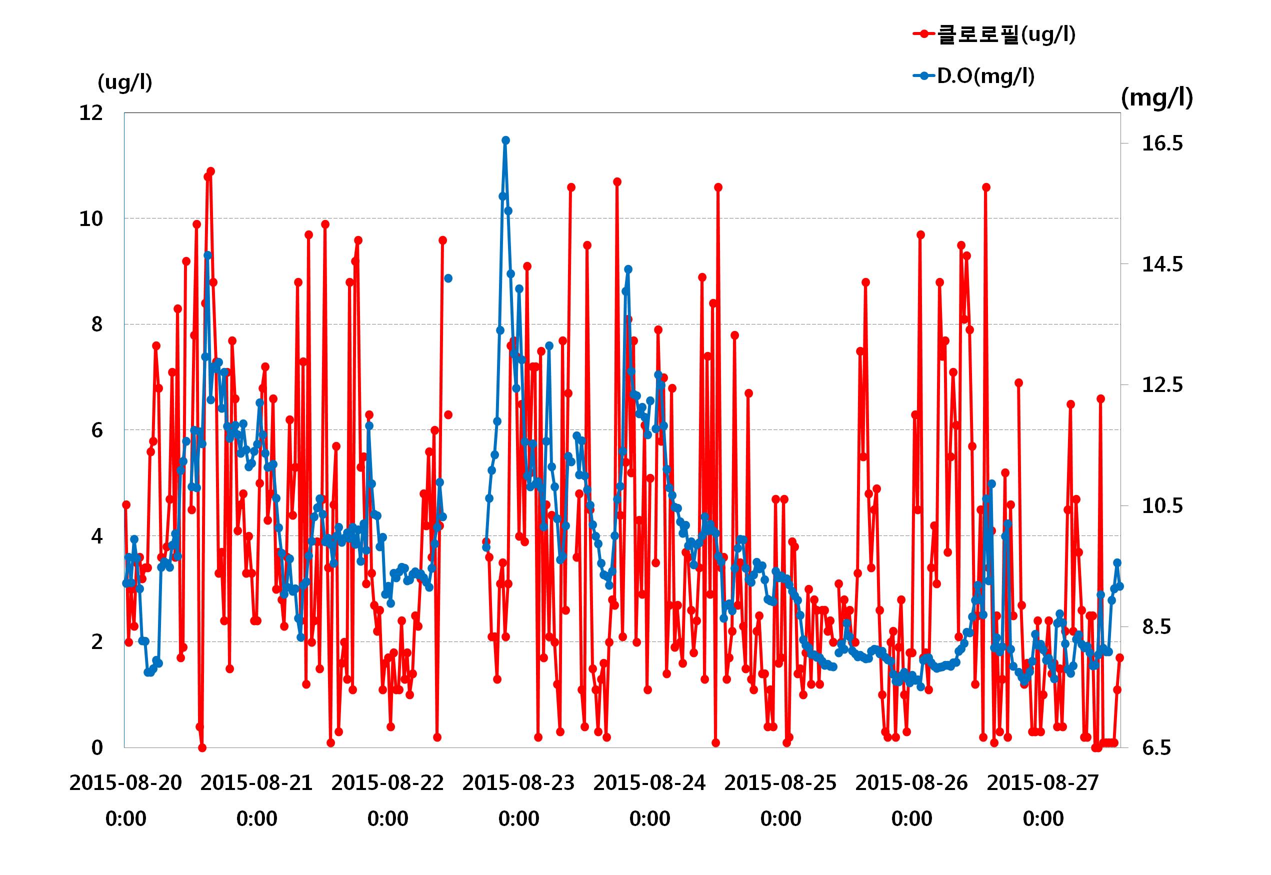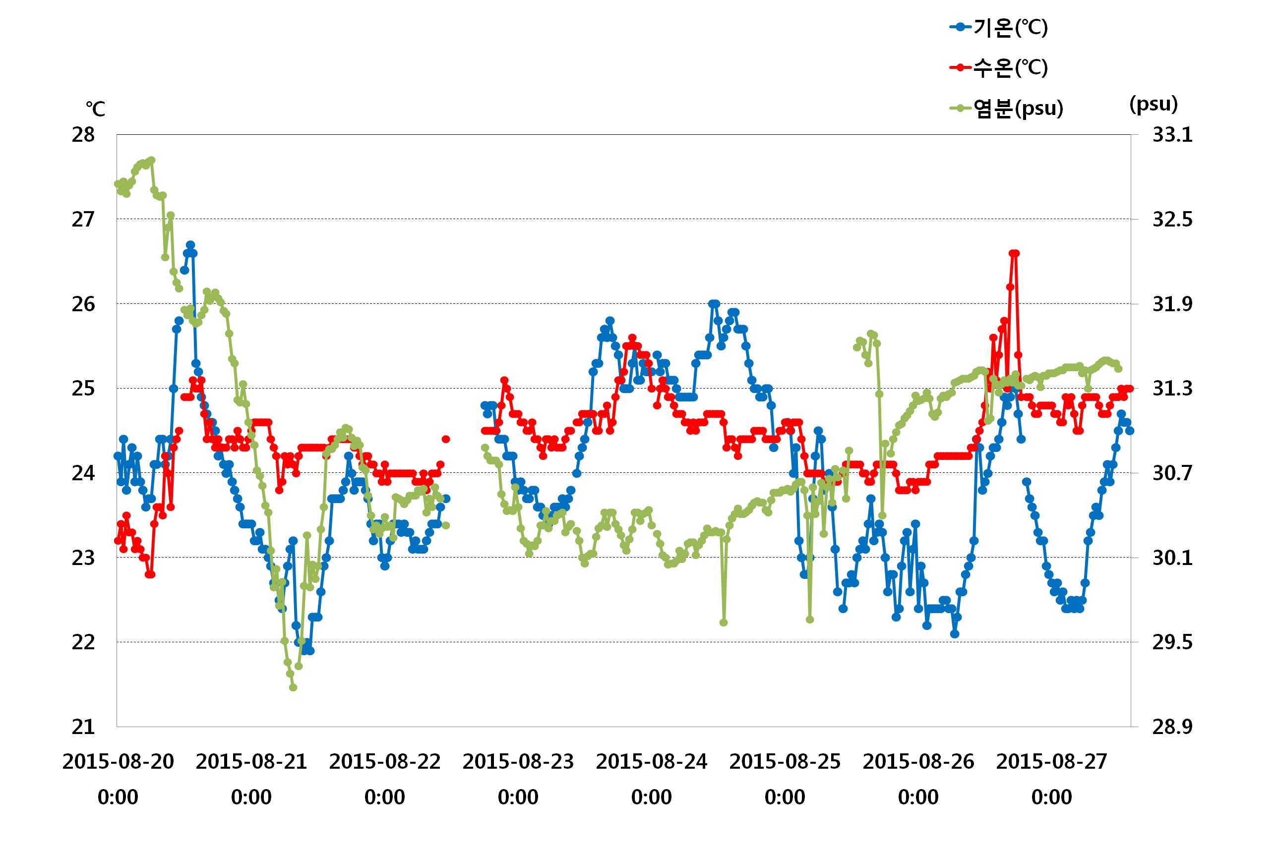 ◦ 관측부이가 설치되어 있는 지역은 조류(tidal current)가 우세한 지역이라 전반적으로 남동류와 북서류가 우세하며, 8월 20일∼270일 중 최대유속은 46.4(cm/s)이며, 최저유속은 0.2(cm/s)입니다. ◦ 아래의 그림은 8월 20일∼8월 27일까지의 기온, 수온, 염분, 용존산소, 클로로필-a의 일별 변동으로 24시간 변동 범위의 수온 22.8∼26.6℃, 기온 21.9∼26.7℃, 염분 29.2∼32.9(psu)의 범위였으며, 클로로필-a는 0.1∼10.9(㎍/ℓ), 용존산소 7.5∼16.5(㎎/ℓ)의 범위를 나타나고 있습니다.