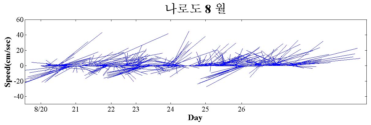 ◦ 관측부이가 설치되어 있는 지역은 조류(tidal current)가 우세한 지역이라 전반적으로 동북류와 남서류가 우세하며, 8월 20일∼27일 중 최대유속은 102.7(cm/s)이며, 최저유속은 0.9(cm/s)입니다.