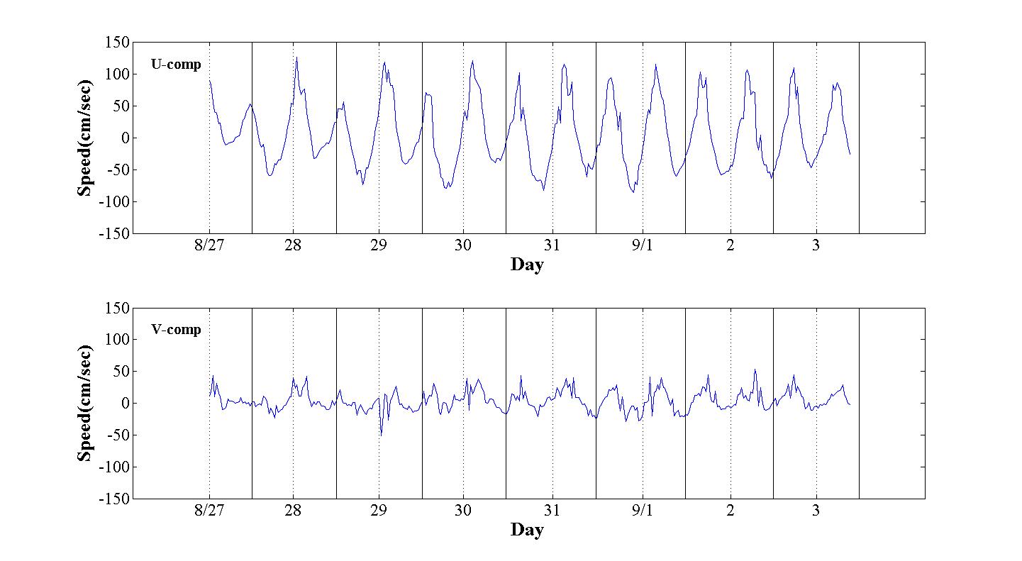 ◦ 관측해역에서의 조류는 전반적으로 동북류(낙조시)와 남서류(창조시)가 우세하며, 8월 28일∼30일(대조기) 사이에 상대적으로 강한 유속을 보이다 점차 약해지는 경향을 보이고, 최대유속은 129.1(cm/s)이며, 최저유속은 0.2(cm/s)입니다.