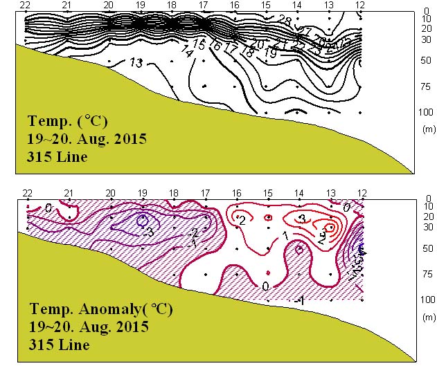 ◦ 2015년 8월 19일~20일 국립수산과학원 수산해양종합정보과에서 조사한 동중국해 북부해역(315선)의 수온 수직분포도와 평년편차도입니다.