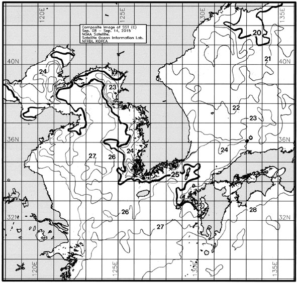 ◦ 금주(2015. 09. 08~2015. 09. 14)의 한국근해 표면수온은 대화퇴 근해 21~22도, 울릉도-독도 근해 22~23도, 대마도 근해 25~26도, 제주도 근해 25~26도, 이어도 근해 26~27도, 가거초 근해 24~26도, 어청도 근해 23~24도, 백령도 근해 22∼23도로 나타납니다. ◦ 「평년에 비해」대화퇴 근해 0.8도 낮게, 울릉도-독도 근해 1도 낮게, 대마도 근해 비슷하게, 제주도 근해 비슷하게, 이어도 근해 0.4도 높게, 가거초 근해 0.8도 높게, 어청도 근해 0.4도 높게 나타납니다. ◦「전년에 비해」대화퇴 근해 2.5도 낮게, 울릉도-독도 근해 2.5도 낮게, 대마도 근해 0.5도 높게, 제주도 근해 2도 낮게, 이어도 근해 0.5도 낮게, 가거초 근해 0.5도 낮게, 어청도 근해 0.5도 높게, 백령도 근해 2.5도 높게 나타납니다. ◦ 수온 전선대는 우리나라 제주해협에서 대한해협까지 25도를 중심으로 형성됩니다. |
