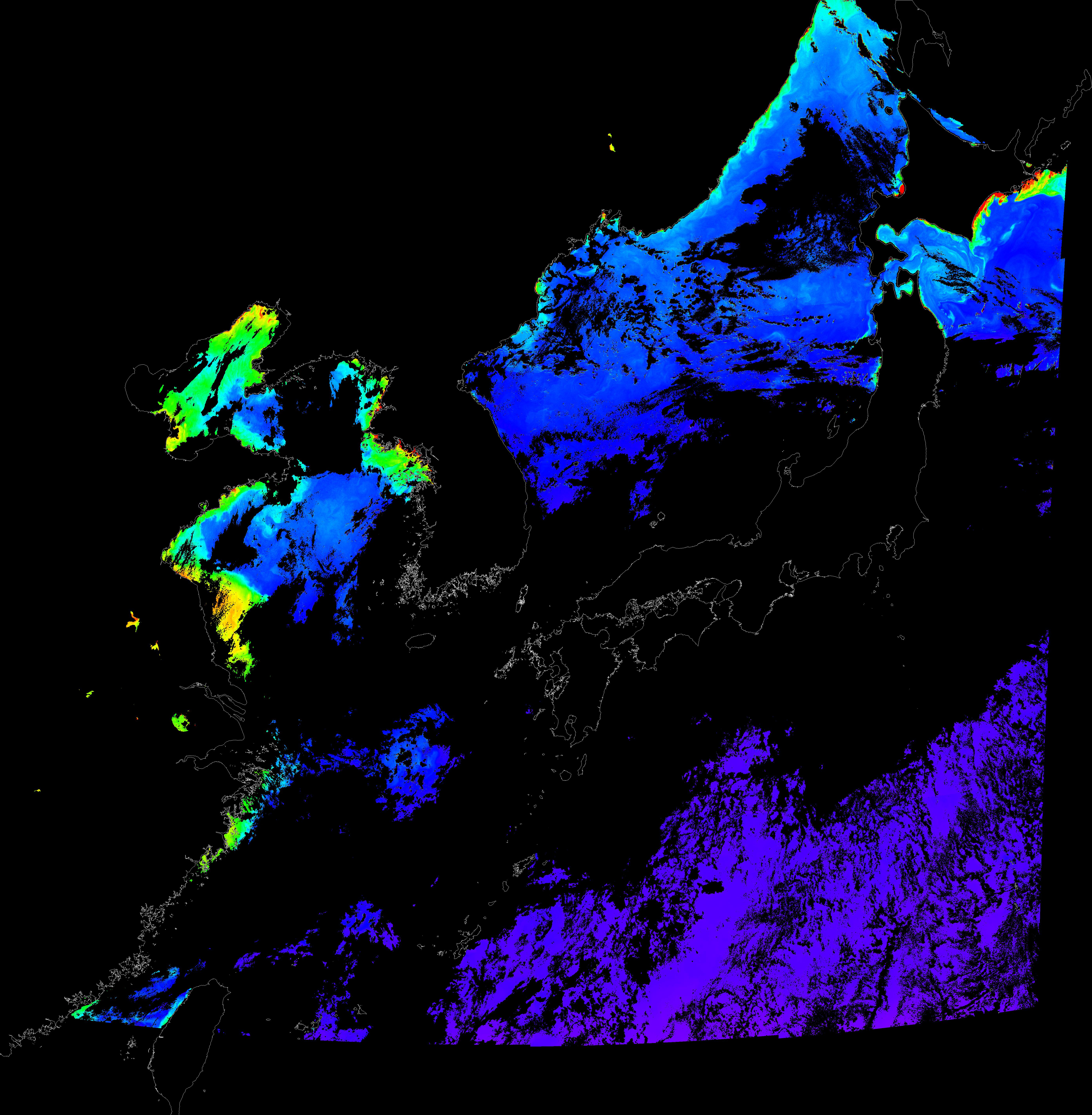 o 2015년 9월 16일 천리안 GOCI 클로로필 a 위성영상입니다.